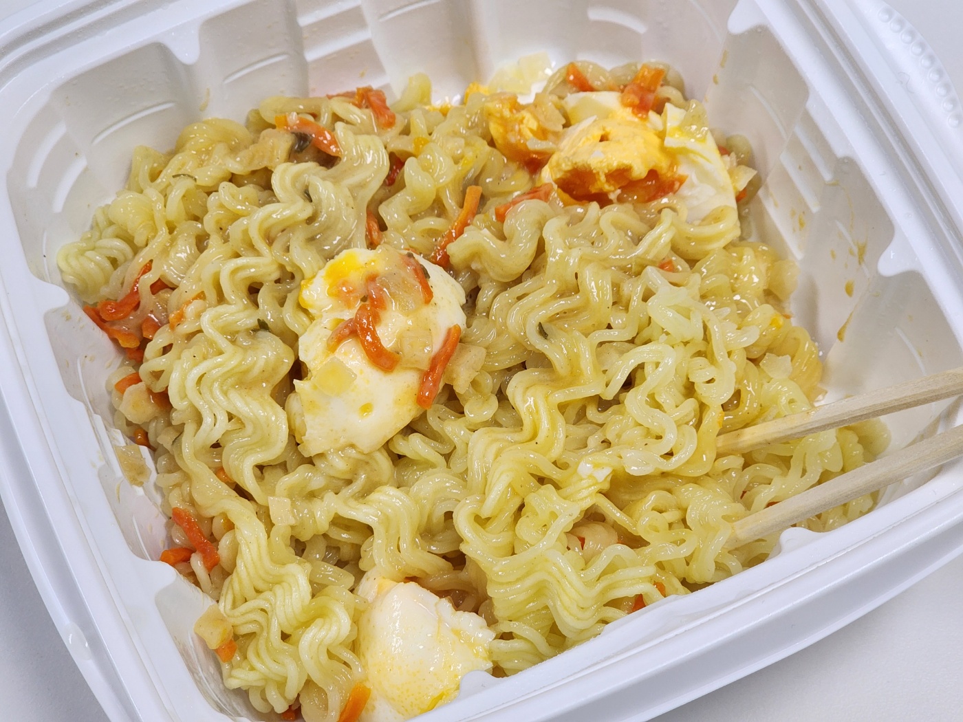 한 입 입에 넣는 순간 참깨 드레싱을 올린 샐러드 맛이 생각났습니다. 그러고나서 제품 커버를 보니 역시나 참깨 베이스의 특제소스였다는 걸 알게 되었습니다. 그동안 먹어왔던 비빔면류들은 고추장이나 케첩 베이스로 자극적인 맛이었는데, 참깨 베이스의 소스에 비벼먹는 맛은 매우 담백하면서도 간도 적절했습니다. 야채 후레이크로 들어 있는 당근은 아삭한 식감이 일품이었습니다.
