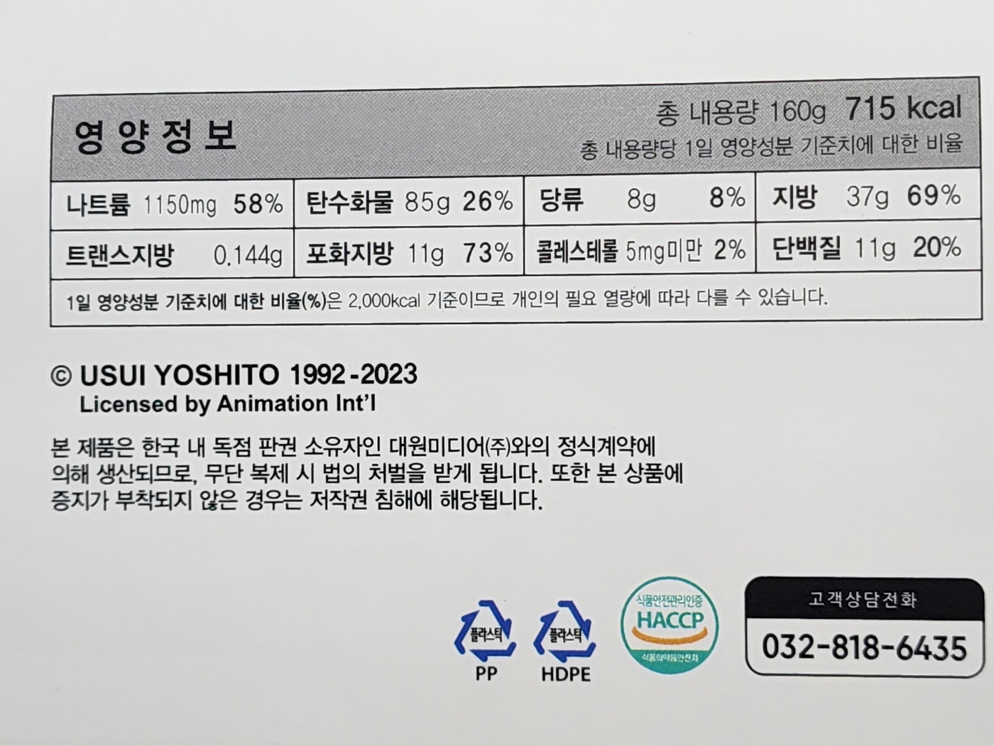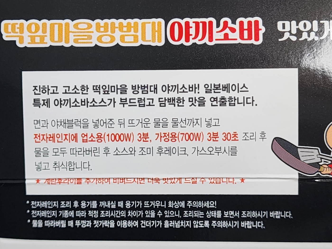 제품 조리방법은 다음과 같습니다. '취식', '계란후라이' 등 일본어 번역풍 표현들이 눈에 좀 거슬리네요. 짱구 띠부씰 말고 제품 전체가 라이선스 카피인 건지 궁금해집니다.