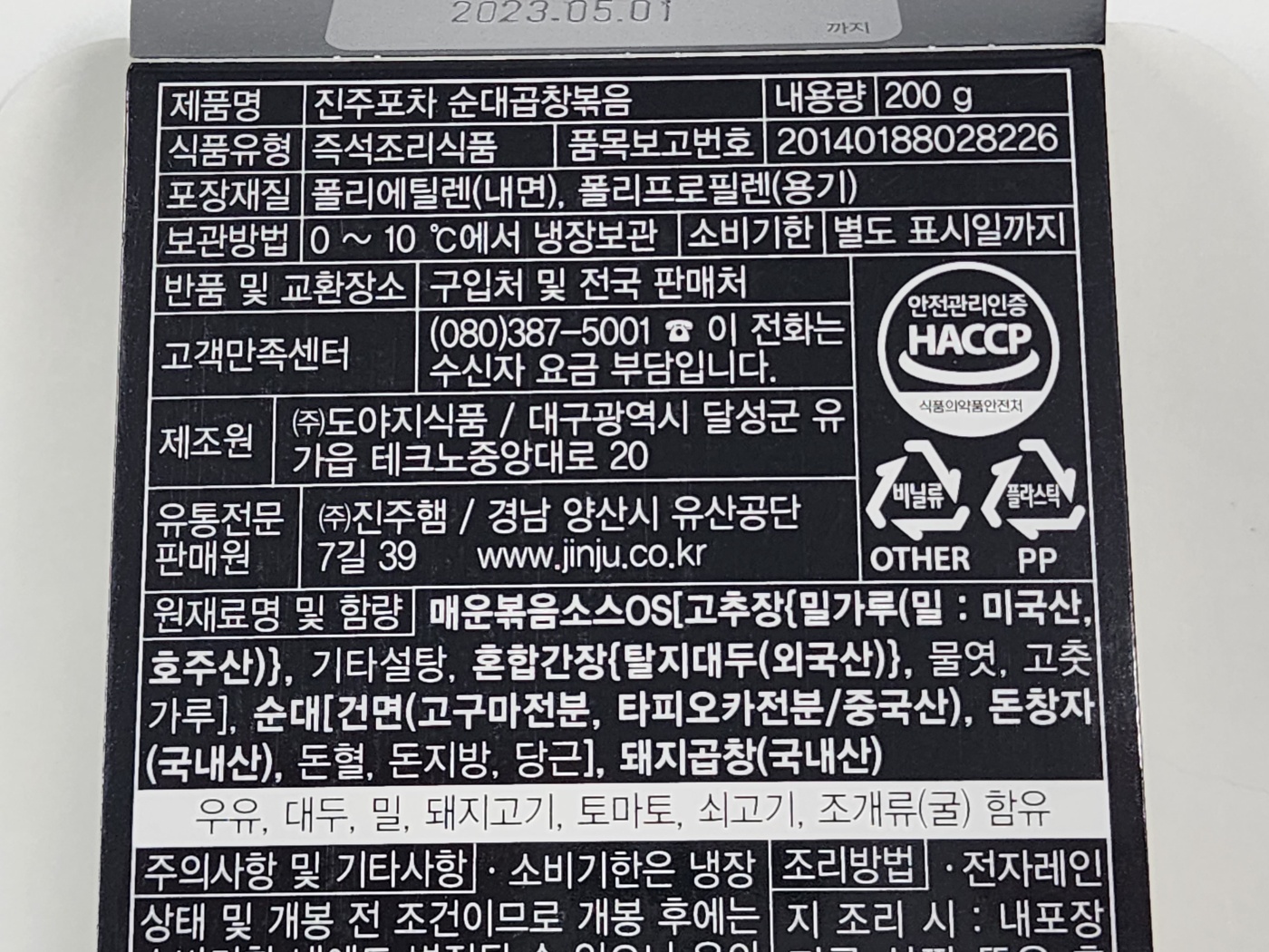 가장 큰 괴리는 채소가 전혀 없다는 겁니다. 식당에 가서 순대곱창볶음 시켜보신 적 있으신가요? 순댇곱창볶음의 맛의 절반은 함께 투입되는 채소들의 몫입니다. 양배추, 파, 깻잎 등의 풍미가 어우러져 순대곱창볶음의 감칠맛을 더하는데, 이 제품은 채소 성분이 전혀 없습니다. 볶음 소스에 묻혀서 안 보이는 게 아니라 성분표시를 봐도 전혀 들어 있지 않습니다.