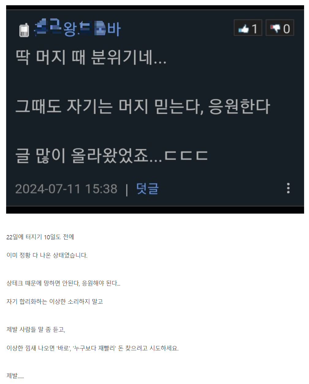 그리고 이때도 제 이런 선택을 조심스럽게 공유했었어요. 장담이나 강요, 으스댐이 아니라 공유였습니다. 아직 사람들이 결과를 모를땐 이런 모든 글들이 유의미합니다. 특히 이때 그냥 틱 던지고 시비거는 것이 아닌, 본인 선택에 대한 근거를 자세히 남겨줄 수록 타인에게 도움이 됩니다. 최종 선택은 각자가 하지만, 그런 판단을 한 근거를 자세히 적는다면 누군가에겐 분명 그 선택과정에서 도움을 주겠다는 생각에요.