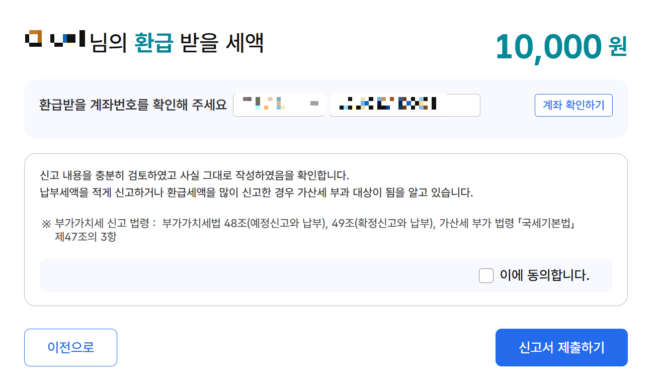 12. 전자세액 공제 어쩌고 얘기가 나오면 모두 '예' 하시면 됩니다.(작성할 내용 없음) 환급 계좌 번호까지 입력 후 '이대로 신고하기' 버튼을 눌러줍니다. 체크박스에 동의하고 '신고서 제출하기'를 눌러줍니다.