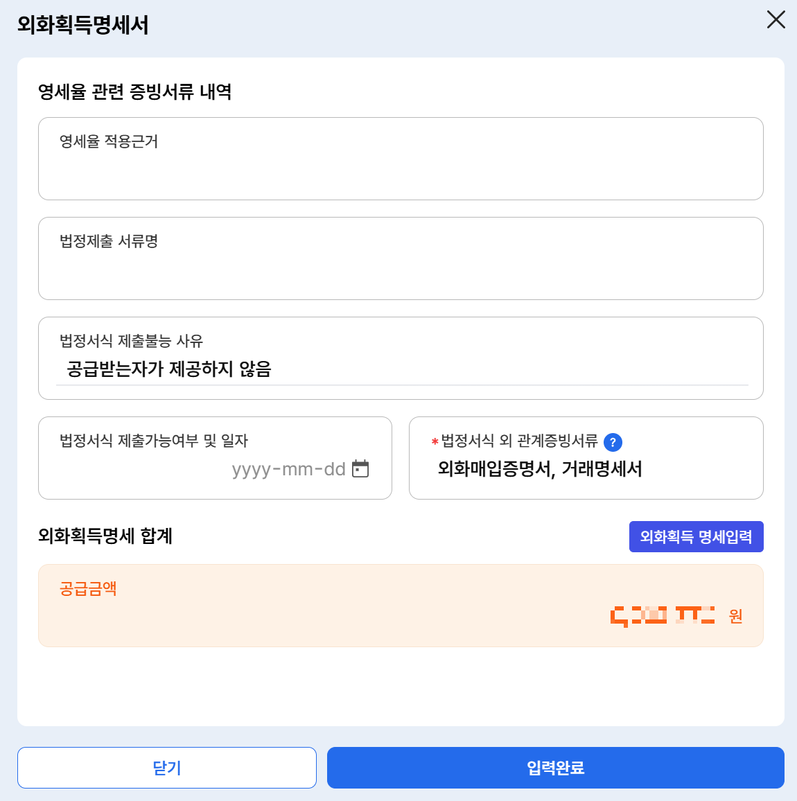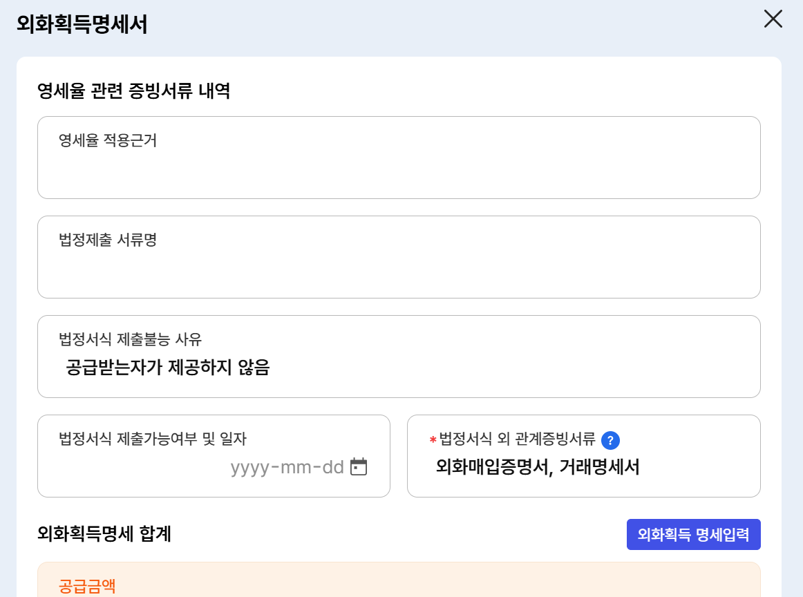 8. 그 다음에는 '외화획득명세서'를 누릅니다. 나타나는 화면에서 아래와 같이 입력하고, '외화획득 명세입력' 버튼을 누릅니다.