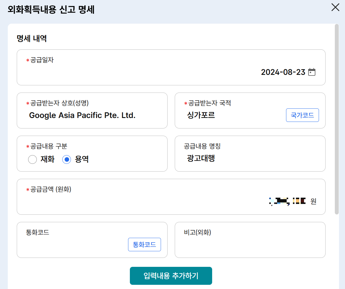 9. 애드센스 광고매출 입금 건별로 아래와 같이 입력하고, '입력내용 추가하기' 버튼을 누릅니다. 여러 건인 경우, 이 작업을 반복하시면 됩니다.