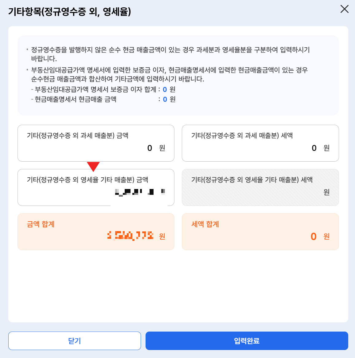 5. 먼저 '매출세액' 칸의 '펼치기' 버튼을 누르고 '기타매출분'을 누른 후, 아래와 같이 신고 기간의 전체 애드센스 매출(수익) 금액을 입력합니다.
