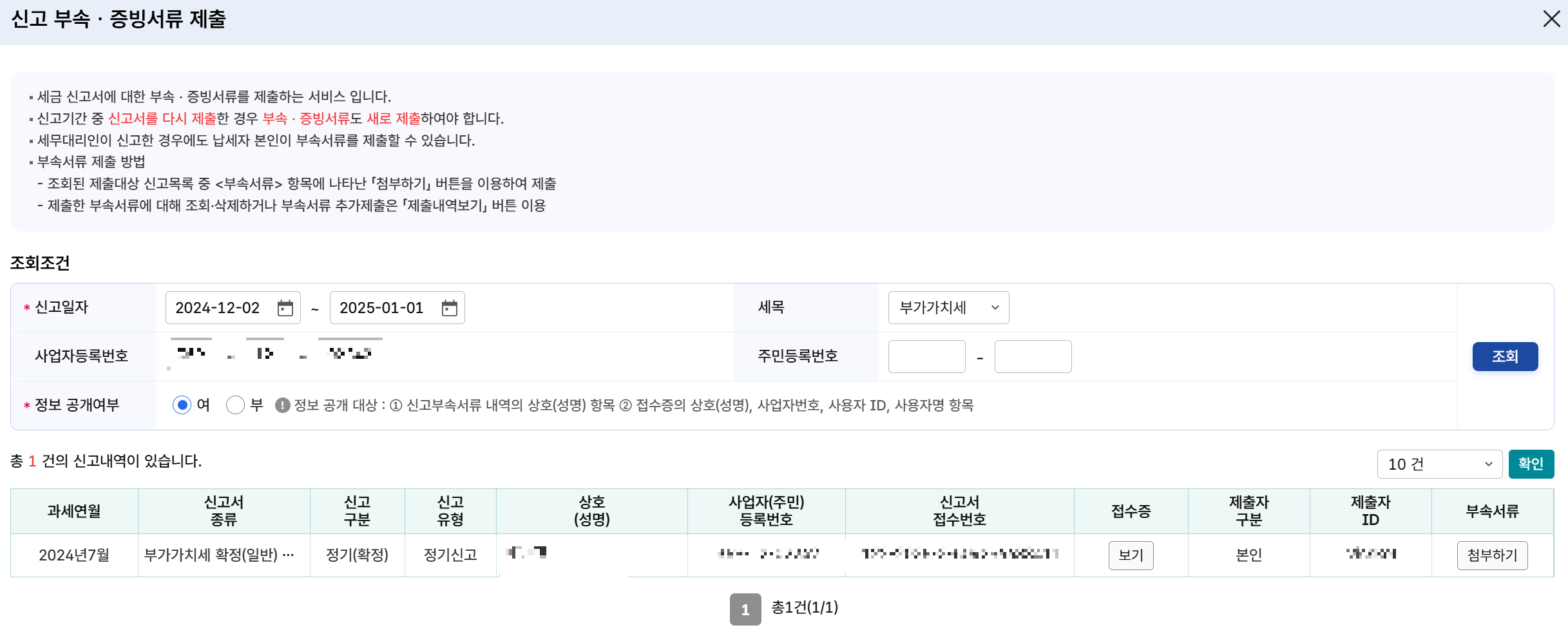 15. '조회' 버튼을 누르면 아까 신고했던 내역이 나옵니다. 부속서류 셀의 '첨부하기'를 눌러서 은행에서 발급받았던 증빙서류를 제출하시면 됩니다.