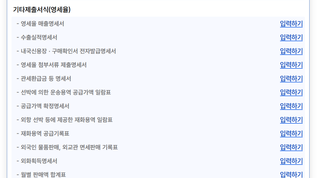 6. '입력완료'를 눌러서 저장하고 나옵니다. 그 다음에는 '기타 제출서식' 칸의 '펼치기' 버튼을 눌러줍니다. 펼쳤을 때 나오는 양식 중 '영세율 매출명세서'와 '외화매입증명서'를 작성해야 됩니다.