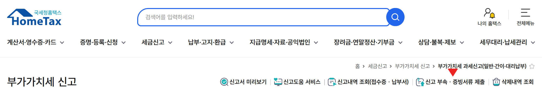 14. 오류가 나는 경우가 있어서 홈택스 메인화면의 부가세 신고 메뉴로 가신 후.... '신고 부속/증빙서류 제출' 메뉴로 들어갑니다.