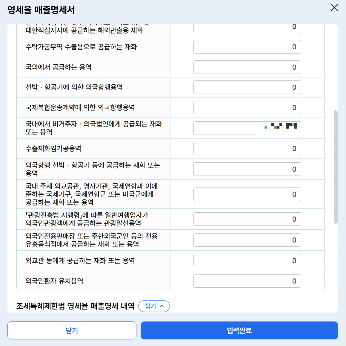 7. 먼저 '영세율 매출명세서'를 눌러들어갑시다. 여기에서 '국내에서 비거주자/외국법인에게 공급되는 재화 또는 용역' 칸에 부가세 신고 대상 기간의 애드센스 매출액(수익금액)을 입력합니다. 그러고 입력완료 버튼을 누릅니다.
