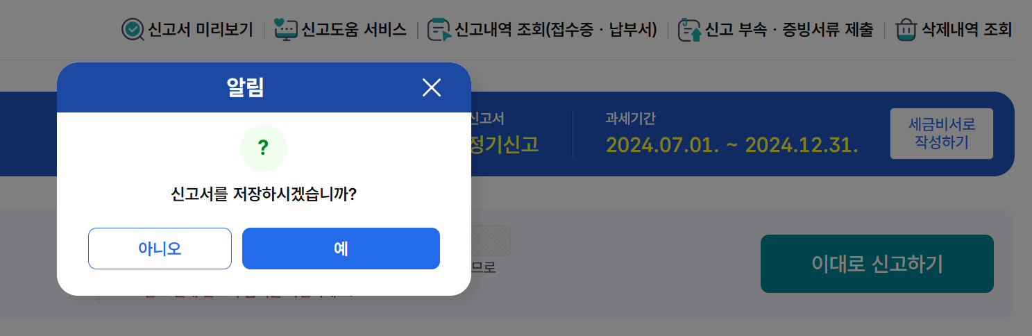 11. '이대로 신고하기' 버튼을 눌러 신고서를 저장합니다.