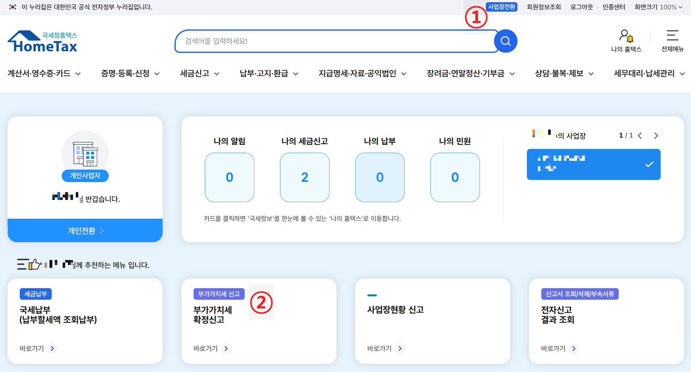 1. 처음에 국세청 홈택스에 로그인 하면 개인 계정으로 로그인됩니다. 1번 '사업장 전환' 버튼을 눌러서 개인사업자 계정으로 전환해주세요. 그 다음에 '부가가치세 확정신고' 메뉴를 눌러주세요.