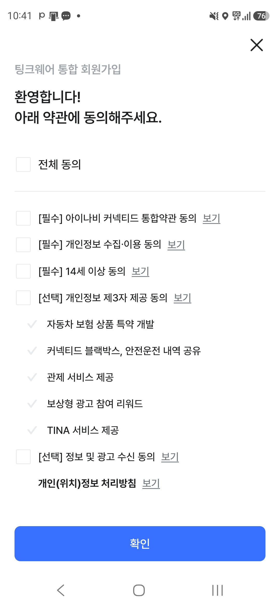 '전체 동의' 체크하시고 맨 밑에 '확인' 버튼 누르세요.